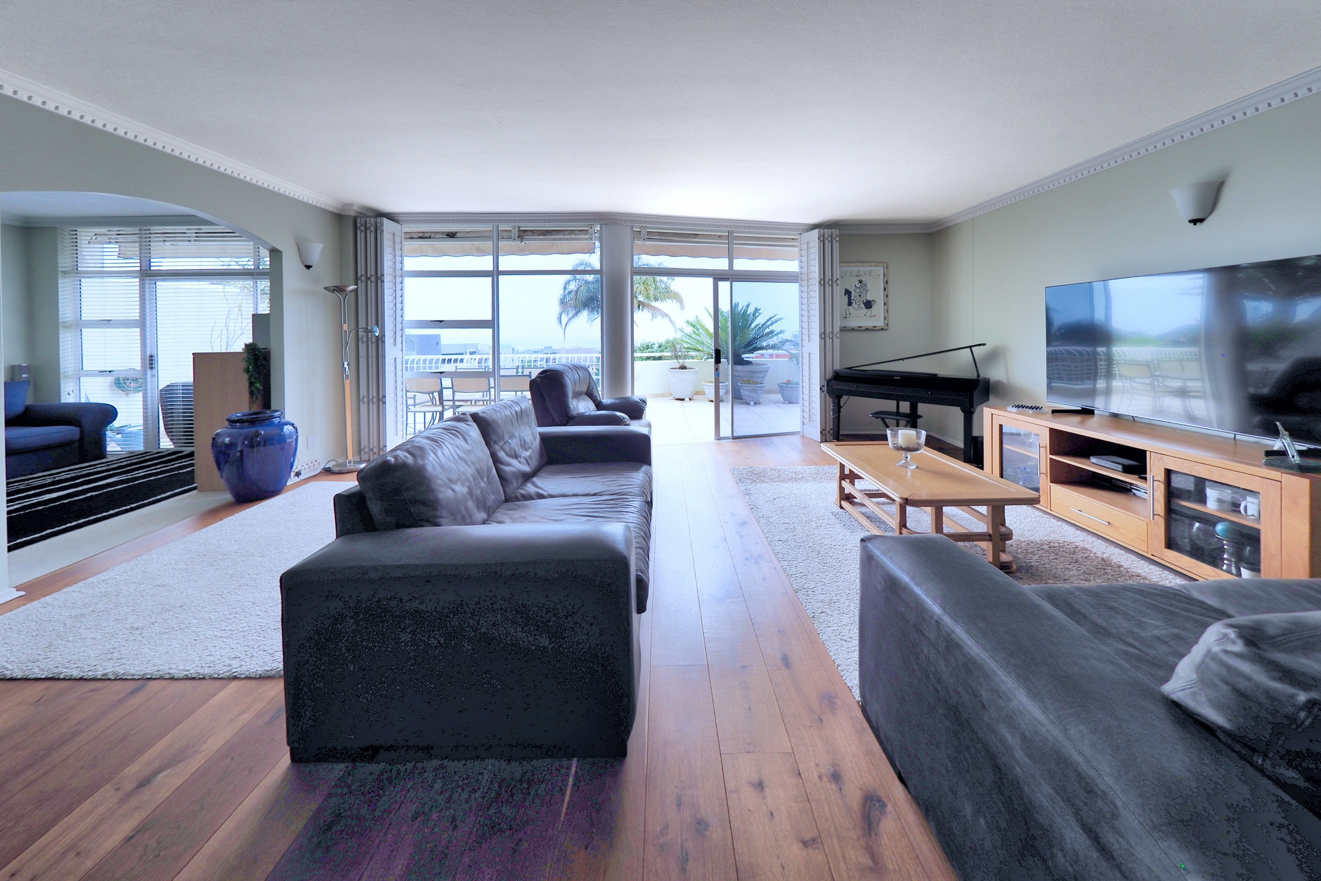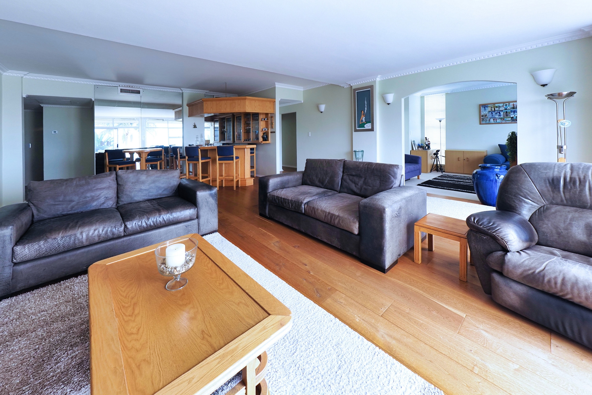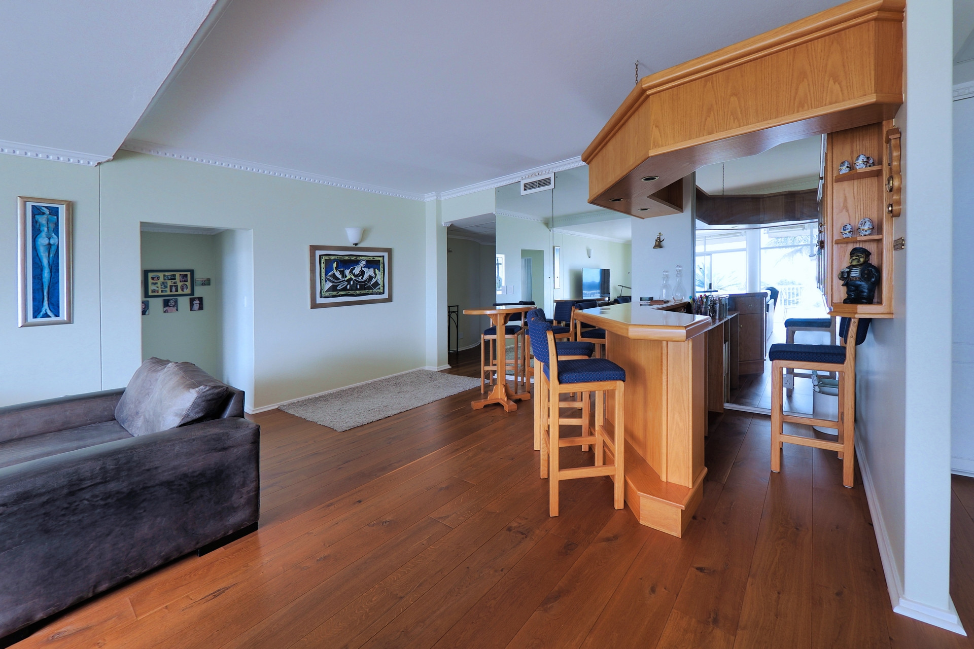 Spacious Lounge & Entertainment Bar: Warm wooden oak flooring and a built-in beechwood bar create the perfect setting for entertaining while enjoying panoramic city and sea views.