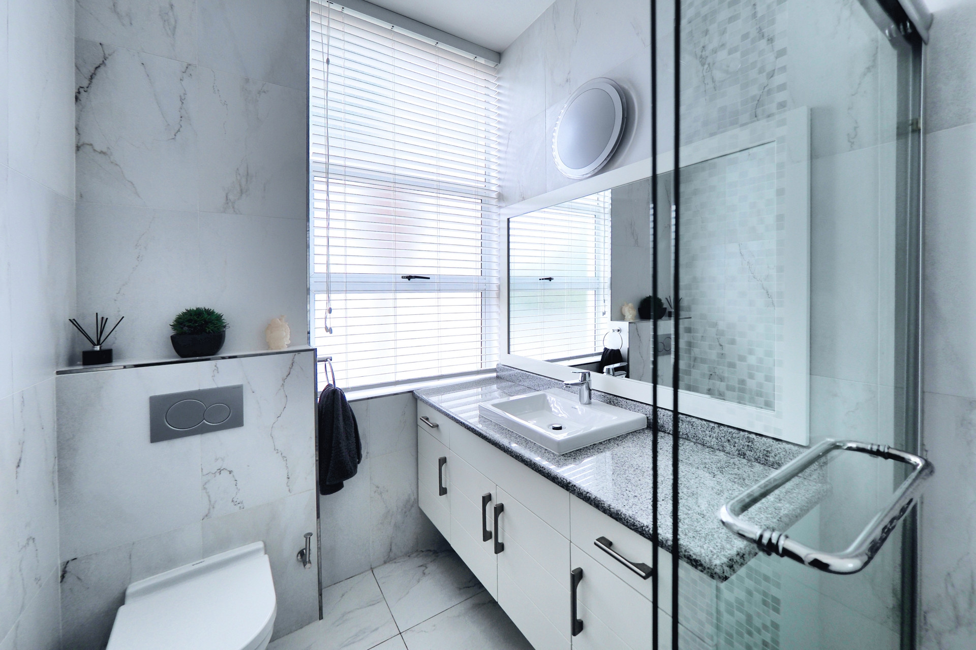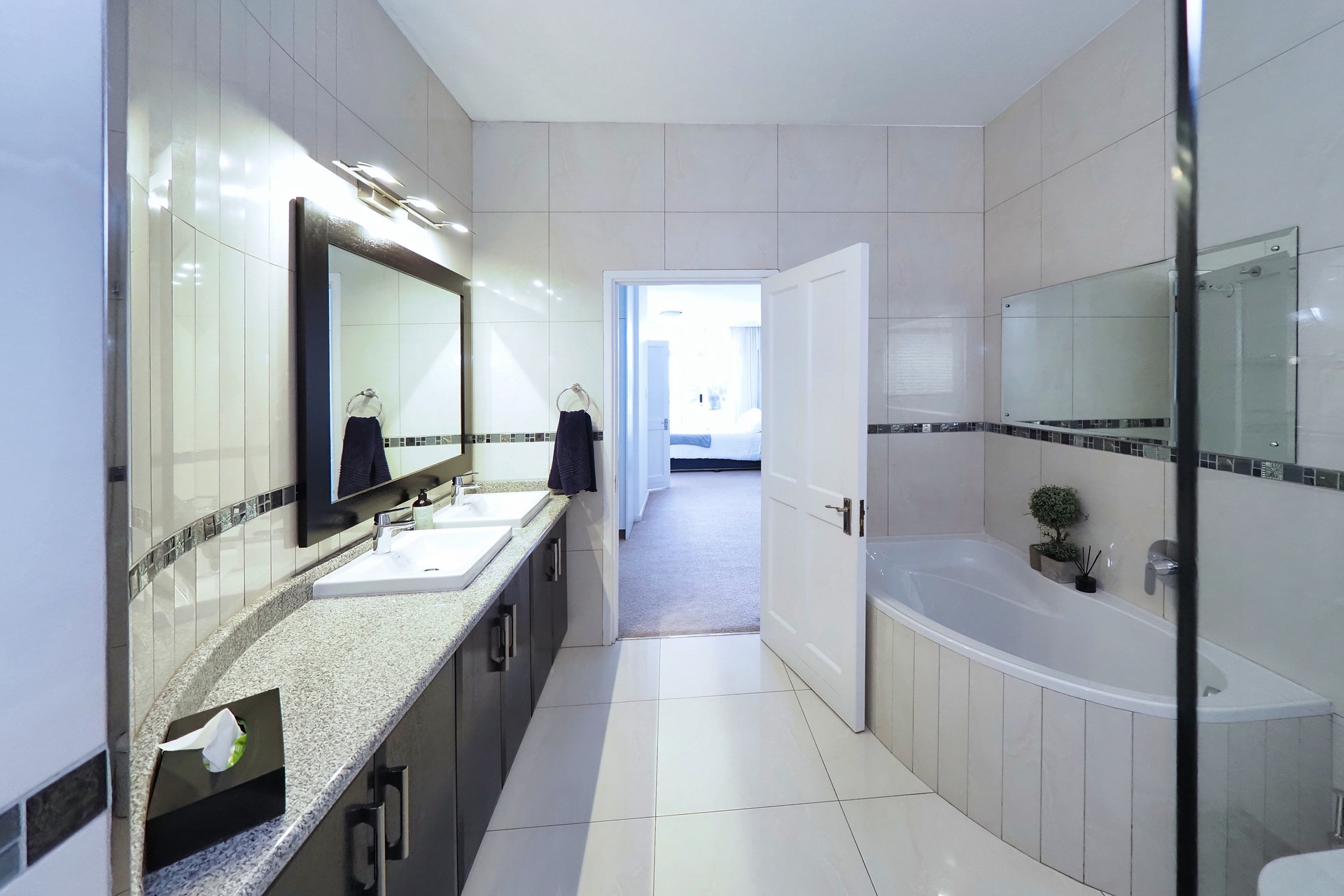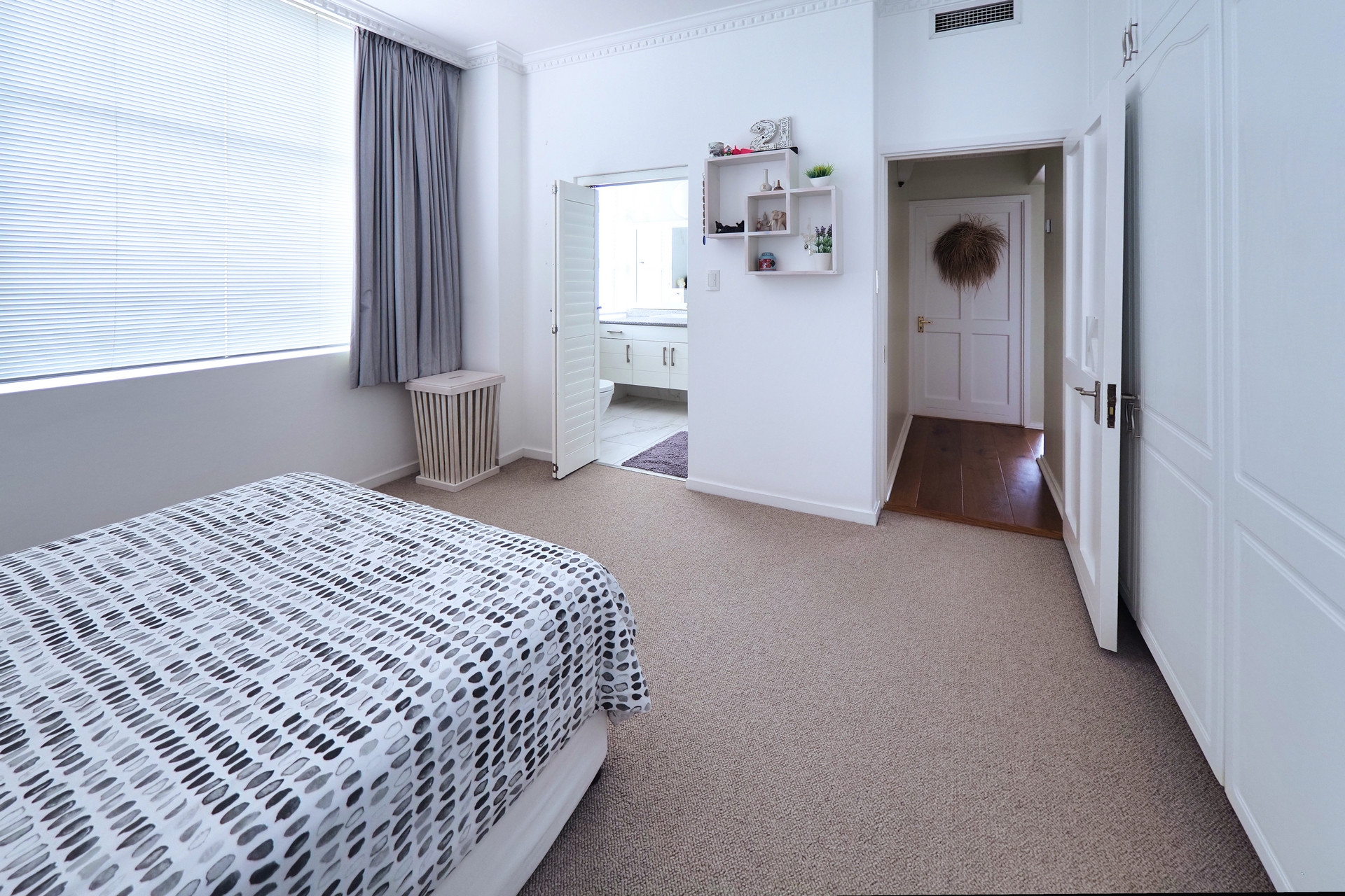 The second bedroom includes an en-suite with a shower, basin, and toilet.