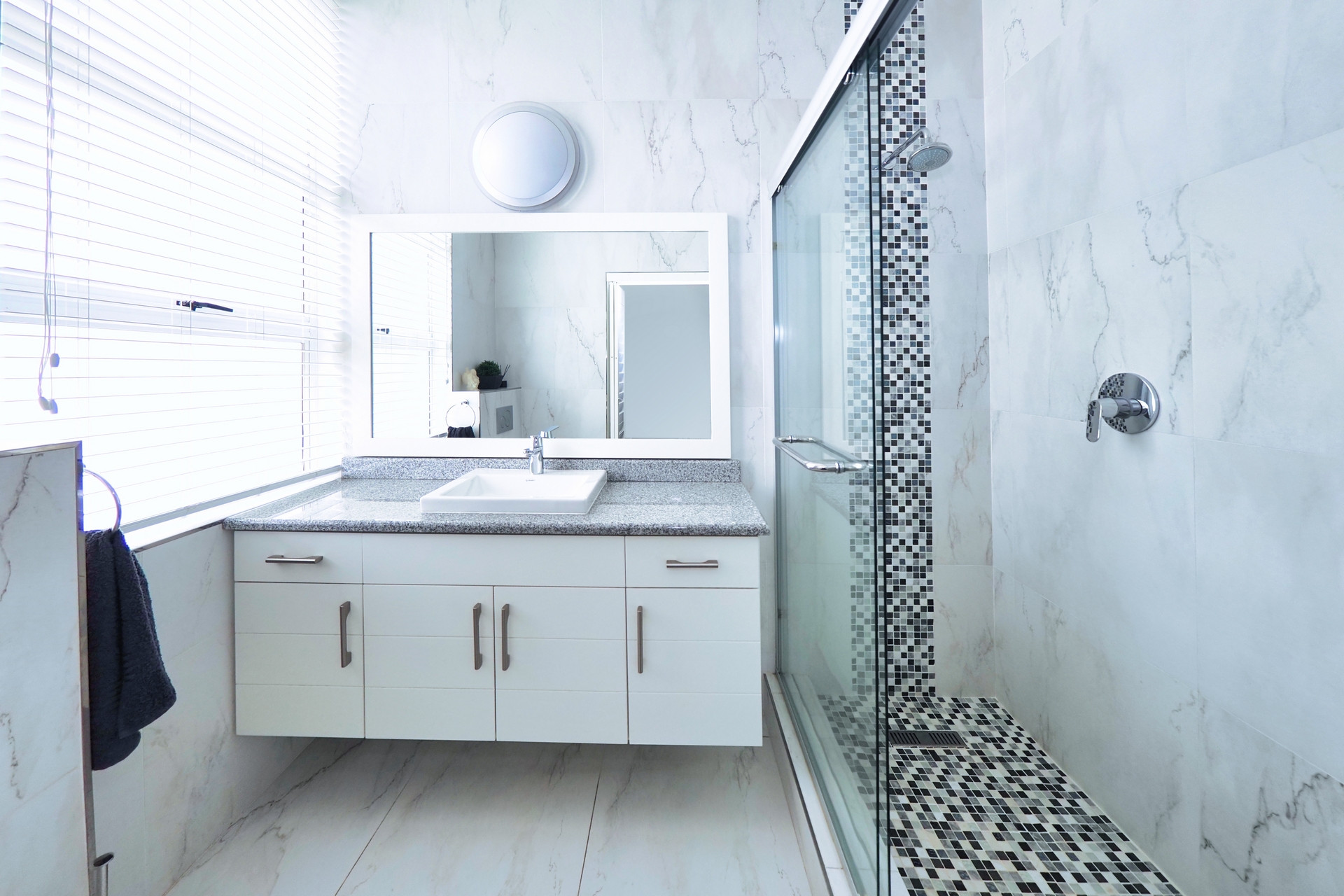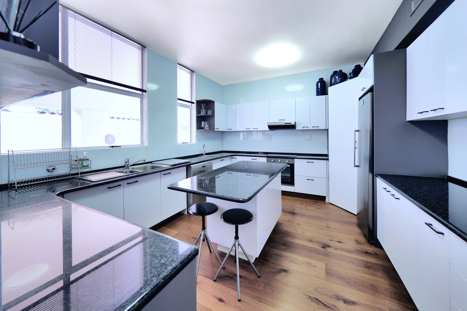 Modern Kitchen: Finished with sleek black granite countertops, ample storage, and plumbing for a dishwasher and washing machine. There is also space for a dryer.