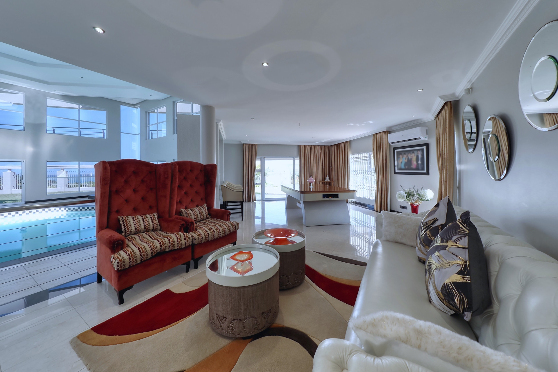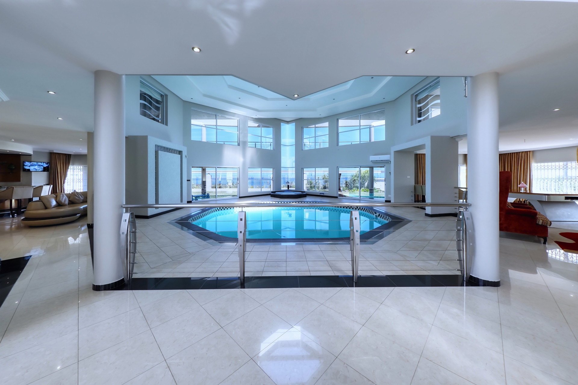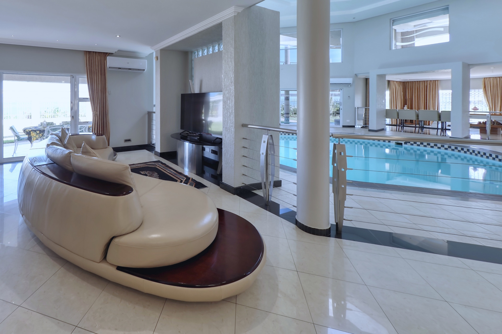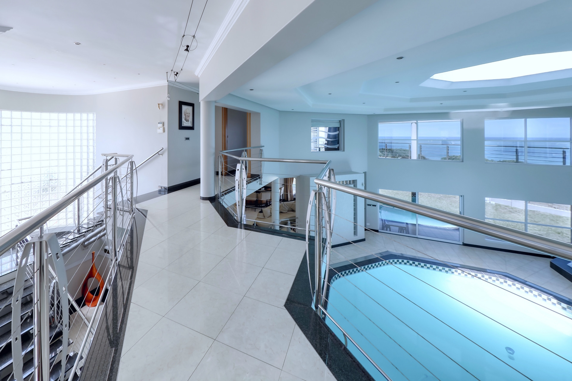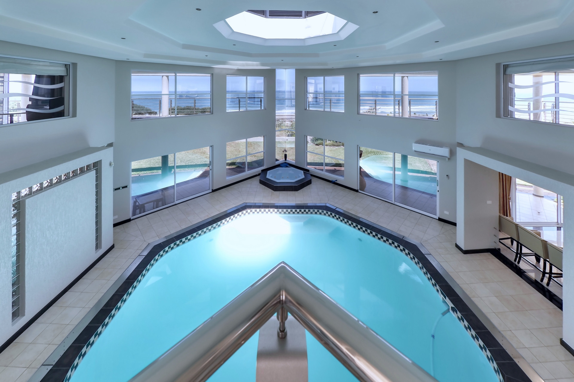 Extent: ± 4 582 m² | 5 Bedrooms | 4.5 Bathrooms (3 ensuite) | 4 Garages | Modern kitchen and scullery | Indoor swimming pool | Jacuzzi | Generously sized garden | Battery/Inverter | Sea views